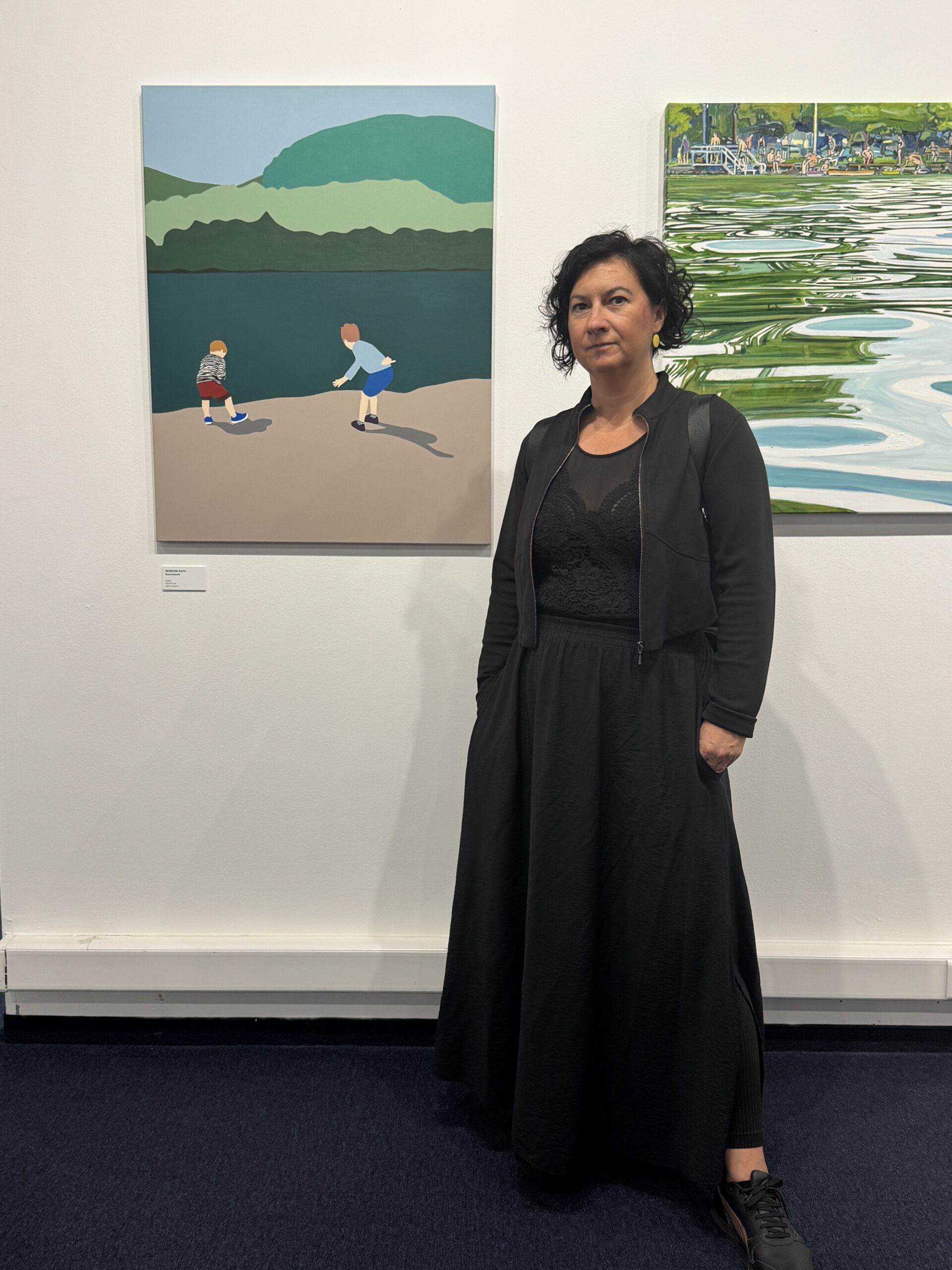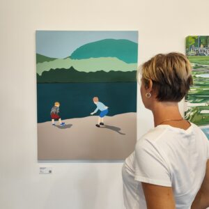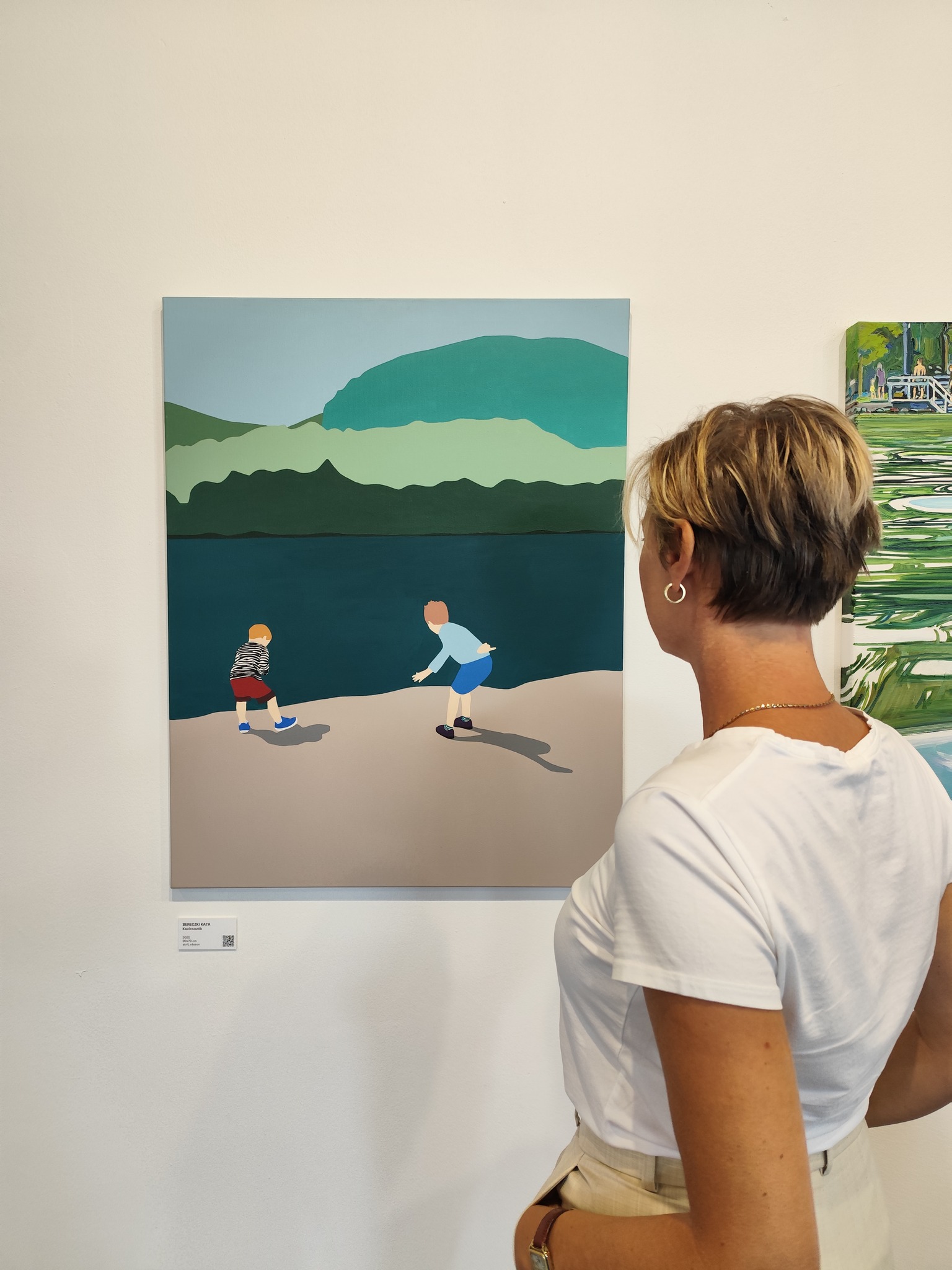 „2019-20-ban festettem néhány képet a szűk családomról, legközelebbi hozzátartozóimról. Ez sem előtte, sem azóta nem volt jellemző, és akkor sem egy tudatos döntés volt. Így utólag a Covid járvány miatti összezártsággal tudom összefüggésbe hozni, hiszen abban az időszakban mindannyian leginkább a szűk családunkra tudtunk támaszkodni. A „Kavicsozók” című képem tehát egyrészt emiatt tekinthető kissé másnak mint a többi; témáját tekintve kicsit leválik a tőlem megszokott vonalról. Másrészről az (eddigi) egyetlen olyan festményem, ahol az alakoknak megjelenítem az árnyékát, ezáltal egy minimálisan kibillentem a képet a síkszerűségből. Nem utolsó sorban ez volt az első képem, ahol mintás felületet is behoztam a teljes homogenitásba (és ezt azóta egyre gyakrabban alkalmazom) az egyes ruhadarabok csíkozásával.”✍